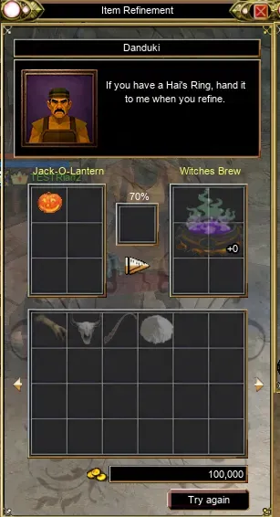 Once you have obtained all 4 items from Nusamlatana Lady, return to Danduki and refine Jack-O-Lantern or Candy into your desired reward. [Rian Village 64,88]